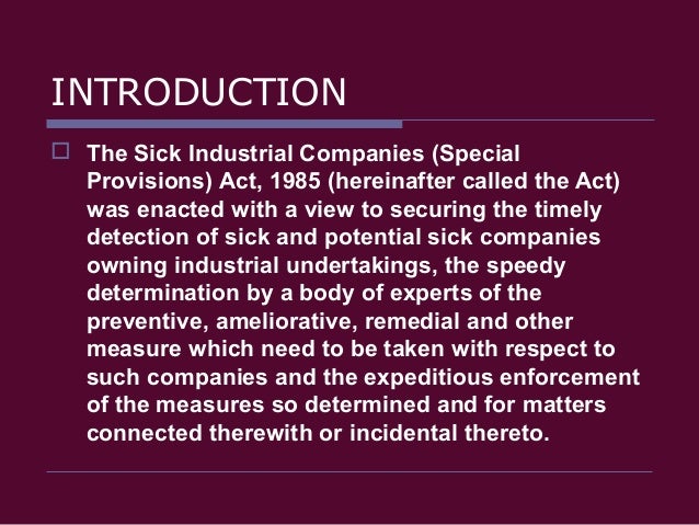 The Sick Industrial Companies Act, 19The Sick Industrial Companies Act, 198 Indian Bare Acts at m, a website for Indian Laws and bareacts, legal advice and law documents in India. But, under the Sick Industrial Companies (Special Provisions) Repeal Act, 2003. SARFAESI Act is independent of the proceedings pending before the BIFR and.